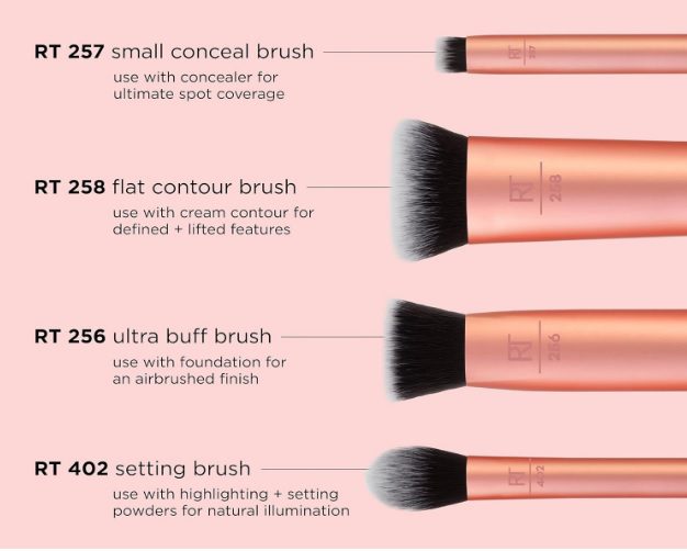 - Includes: (1) RT 256 Ultra Buff Brush, (1) RT 257 Small Conceal Brush, (1) RT 258 Flat Contour Brush, (1) RT 402 Setting Brush
